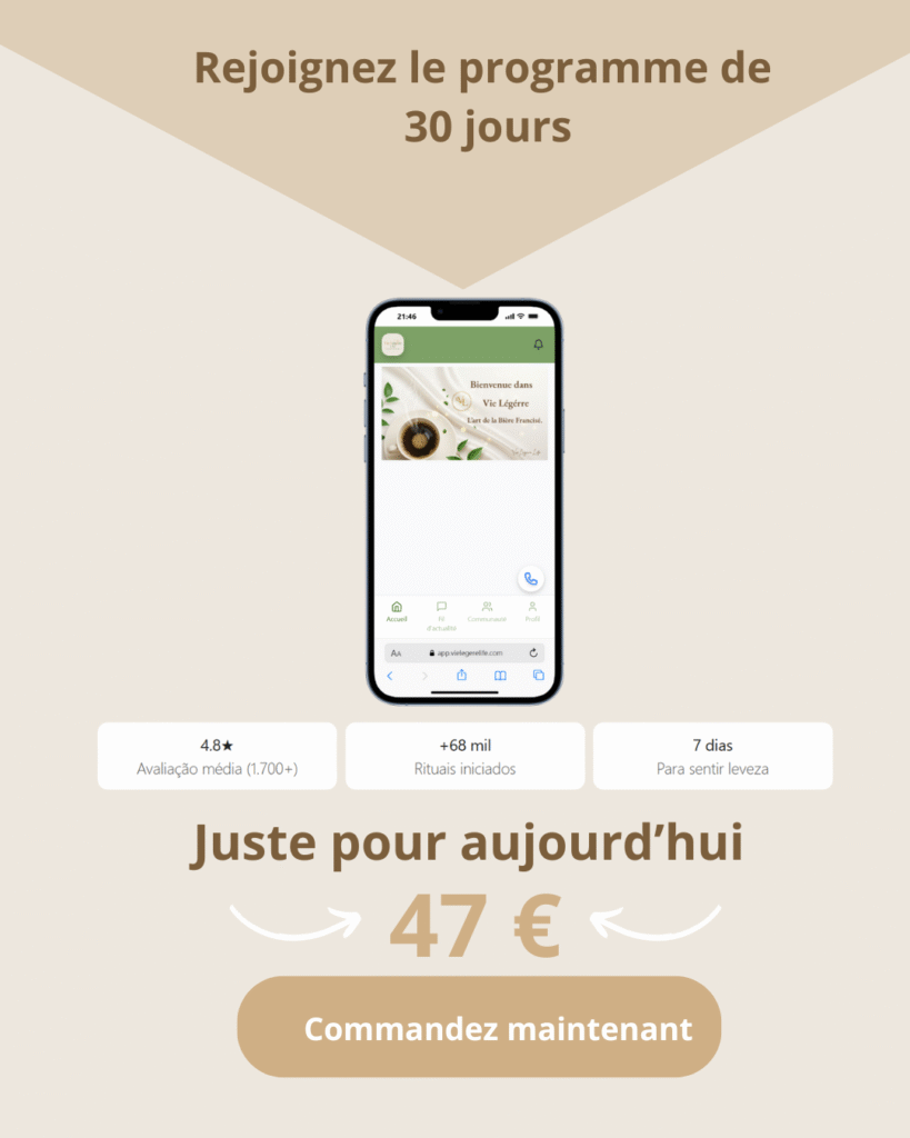 Pendant cette période, vous suivrez une routine guidée avec des recettes exclusives, des conseils quotidiens et de doux défis qui transforment votre bien-être — une tasse à la fois. ☕✨